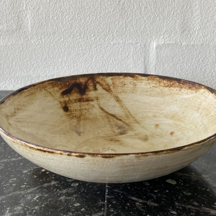 Unika stentøj i bornholmsk ler med glasur af granit. Jeg graver mit ler op på Bornholm – 200 millioner år gammelt ler fra Jura tiden. Det knuser jeg, renser og forarbejder, så jeg kan dreje i det og brænde det som stentøj ved 1260 grader. Glasurerne er ligeledes hjemmelavede af lokale råstoffer fra Bornholm: Rønnegranit, Risegårdsler, kaolin, feldspat og sand fra Dueodde. Granitglasuren står også smukt på kopper og skåle drejet i porcelænsler. Jeg har også lavet gyldne glasurer af lokalt ler fra Orenæs på Nordvestfalster og af ler fra kysten ved Pomlenakke.