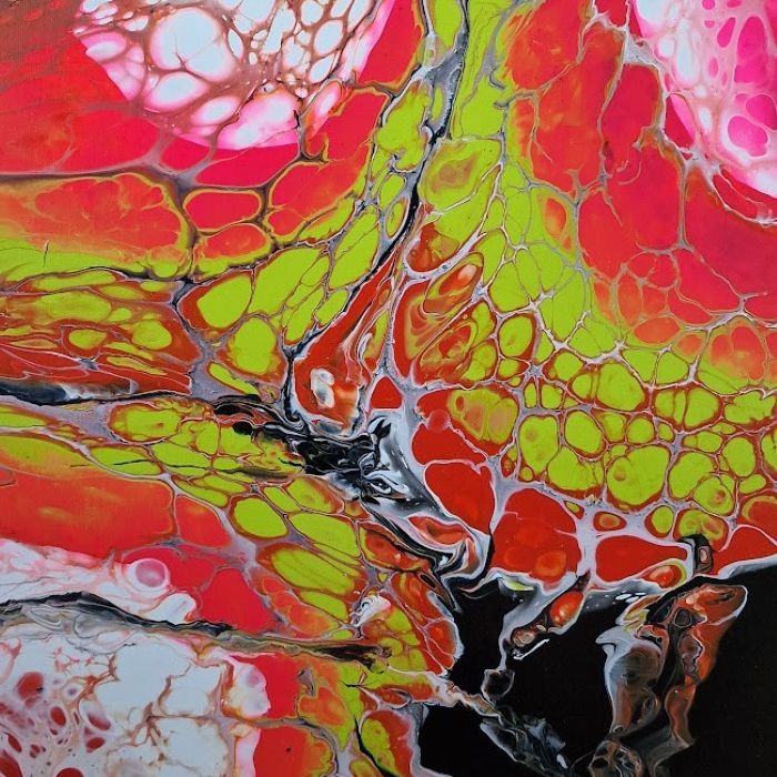 En decideret inspirationskilde havde jeg ikke. Jeg startede med farver på lærredet, og så hvor jeg endte. Den teknik arbejdede jeg med i et par år. I 2018 brækkede jeg højre ben og blev i en periode sat lidt ud af spillet med at male. Men til gengæld kunne jeg så se videoer på YouTube. Her stiftede jeg bekendtskab med teknikken Pouring. Flydende akryl. Den teknik har jeg arbejdet rigtigt meget med siden. Den måde som farverne blander sig med hinanden i processen, hvor de flyder sammen når cellerne kommer frem. Det syntes jeg er helt fantastisk at opleve.