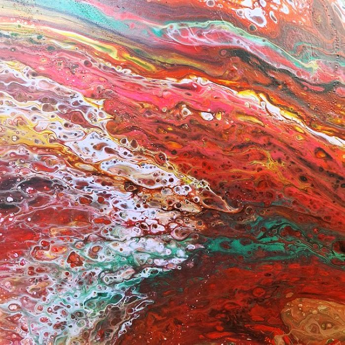 Derefter klarer malingen selv resten af processen. At se hvordan farverne flyder ind i hinanden, skifter nuancer og laver de flotteste mønstre, det kan gøre mig helt euforisk. Jeg skifter mellem teknikkerne, alt afhængig af hvilket humør jeg er i, og hvad lysten er den pågældende dag. Men f.eks. om sommeren hvor jeg gerne vil stå ude i haven og male, der kan jeg ikke arbejde med pouring, da det foregår på et liggende lærred, så der laver jeg akryl på staffeliet med diverse materialer.
